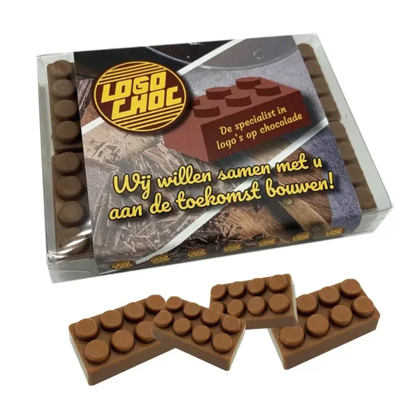 Ontdek de heerlijke zoete verleiding van Belgische chocolade in de vorm van bouwblokjes! Vers geproduceerd bij opdracht . Belgische chocolade in de vorm van bouwblokjes. Snel leverbaar en altijd mooi te personaliseren met bijvoorbeeld een banderol.